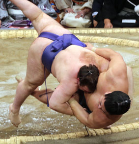 らの攻めで寄り倒した。若元春はうっちゃりにいったが無理だった。