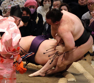 龍は大きくくずれ両手をついた。藤ノ川は初の上位だけに苦戦する