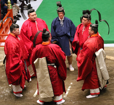 (呼び出し)も、ふしょう(行司)も、いでい(審判)も姿をかえ