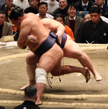 琴桜と若元春戦はもつれた。左四つ、若元春は琴櫻に上手を与えな