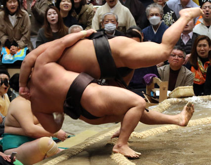 た。豊昇龍は捨て身の投げにいったが、義ノ富士は腰を落としてつ