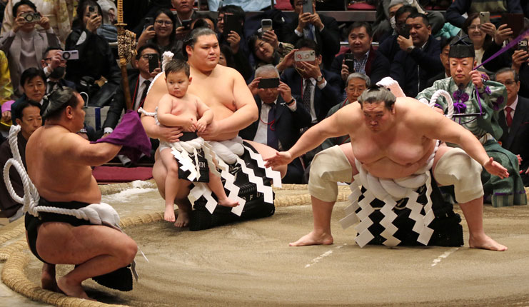 豊昇龍を従えた。幼子をかかえての入場だったさすがに土俵入りの