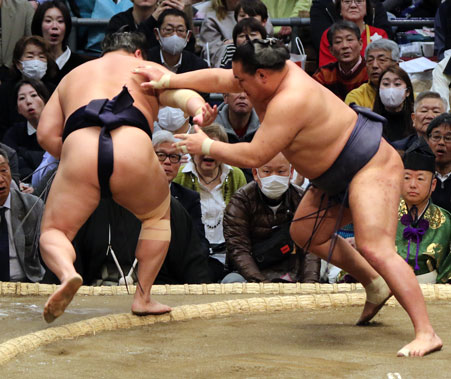 四つとなり、大の里は上手がとれない。巨体熱海富士が果敢に寄る