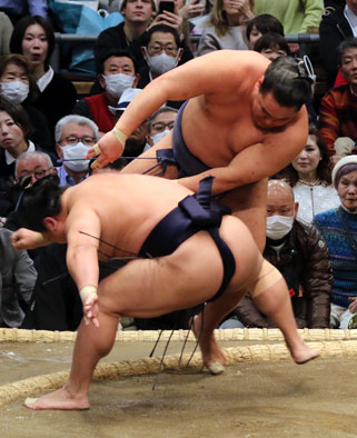 の出足に豊昇龍素早く引いてまわりこんだ。泳ぐ体勢の若隆景を送